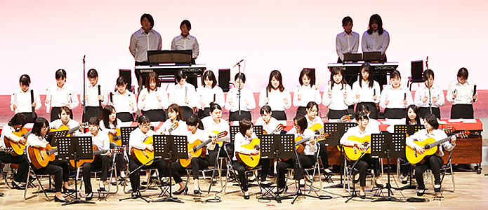 毎年2月上旬、学生生活の集大成として総合発表会を行っています。保育科では1年生による管楽器、ギターなどの実技演奏ほか、ピアノ演奏、合唱、また大好評の2年生によるオペレッタと盛りだくさんの内容となっています。特にオペレッタでは配役はもちろんのこと、演奏、演出、道具、衣装などすべてを学生たち自身で作り上げていきます。この取り組みには大きな苦労もありますが、もっとも心に残る想い出となり、保育者として、いち人間としての大きな糧になることでしょう。